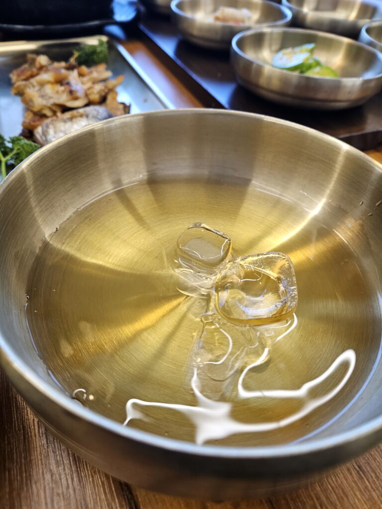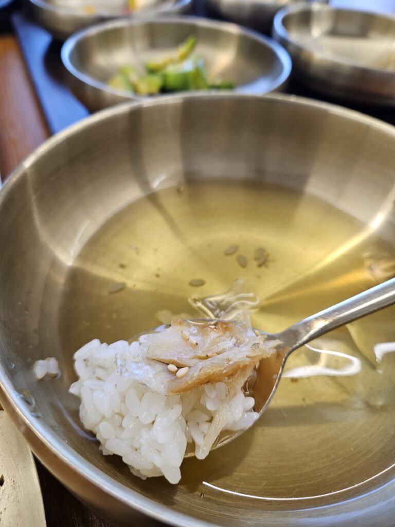 보리굴비는 이렇게 얼음이 담긴 대접과 작은 녹차병이 함께 나와서 녹차를 부어서 먹을 수 있게 되어 있습니다.